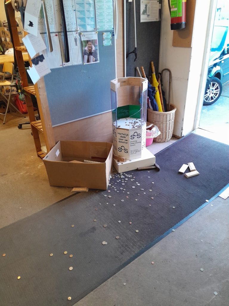 Afgelopen weekend, zaterdag 20 op zondag 21 december is op zeer brutale wijze ingebroken in de loods van SOS aan de Langeweg in Oud Beijerland. Niets vermoedend komt Monica, één van onze fantastische vrijwilligers, op maandagmorgen aanrijden en ziet dat de blauwe roldeur, gevestigd aan de kopse kant van het pand, helemaal kapot was en open stond. Zij schrok zich een ongeluk en parkeerde haar auto aan de voorzijde. Bij de Voedselbank, onze overburen, ziet zij volop politie en de eveneens geschrokken vrijwilligers van de Voedselbank. Direct liep Monica naar één van de politiemensen en nam deze mee naar onze loods. Er werd een enorme chaos op de grond aangetroffen van kleding, glas, houtsplinters, een leeggegooide knopendoos en buitenlandse munten. De geldzuil was kapot geslagen en de spaarpotjes waren gesloopt en de inhoud van beide was verdwenen. Omdat ons pand prima is beveiligd tegen inbraken, hebben de daders bij de Voedselbank ingebroken om daar de sleutel van de grote koelwagen te pakken en daarmee de roldeur van onze loods te rammen. Het was een verschrikkelijk beeld. Verder in de loods bleek ook het zilveren spaarvarken met de daarin de opbrengst van de verkochte Kerstengeltjes gestolen. Deze Kerstengeltjes zijn gemaakt door demente bewoners van Verpleeghuis Sonneburgh in Rotterdam Charlois. Samen met de opbrengst van de Kerstengeltjes en de door de bewoners van Sonneburgh verkochte Kerstkaarten en andere zelfgemaakte snuisterijen, zou het totale bedrag aan SOS gedoneerd worden voor het uitreiken van voedselbonnen in de maand januari.