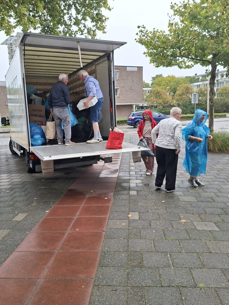 Zoals iedere keer was deze dag een echt feest op het terrein voor de kerk “De Verbinding” waar de bakwagen van Autobedrijf Kooiman uit Oud Beijerland Gerrit, Trijnie, Rien, Huib en Yvonne klaar stonden om alle zakken, tassen en dozen in ontvangst te nemen van de vele mensen die hun spullen kwamen brengen. Grandioos !!